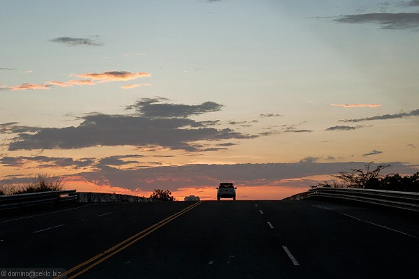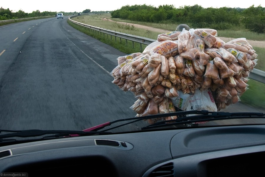 Pár výcvaků zpoza čelního skla. Doprava má své zvláštnosti, silnice jsou kolísavé kvality od "naprosto v pohodě" asfaltek aneb co by jsme za takové v Čechách dali po "naprostá hrůza" - šťěrk, samá díra a plazení se 20km/hod. Jezdí vše co má kola a drží nějak pohromadě, dopravní předpisy nikdo zrovna moc neřeší a zpomalení v městech se prostě vynucuje retardéry...